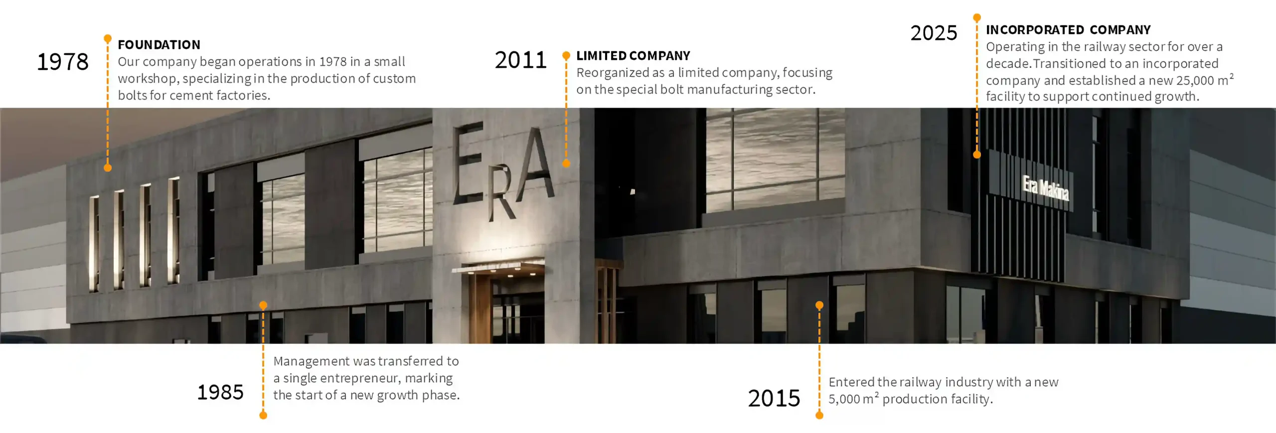 ERA Special Bolt & Machinery Inc. was founded in 1978 by Mechanical Engineer Eşref Celal Katipoğlu. The company initially started its operations with the manufacturing of special bolts and spare parts for the cement industry. Over time, with the engineering expertise and production infrastructure it has developed, the company has successfully undertaken important projects across various industrial sectors.